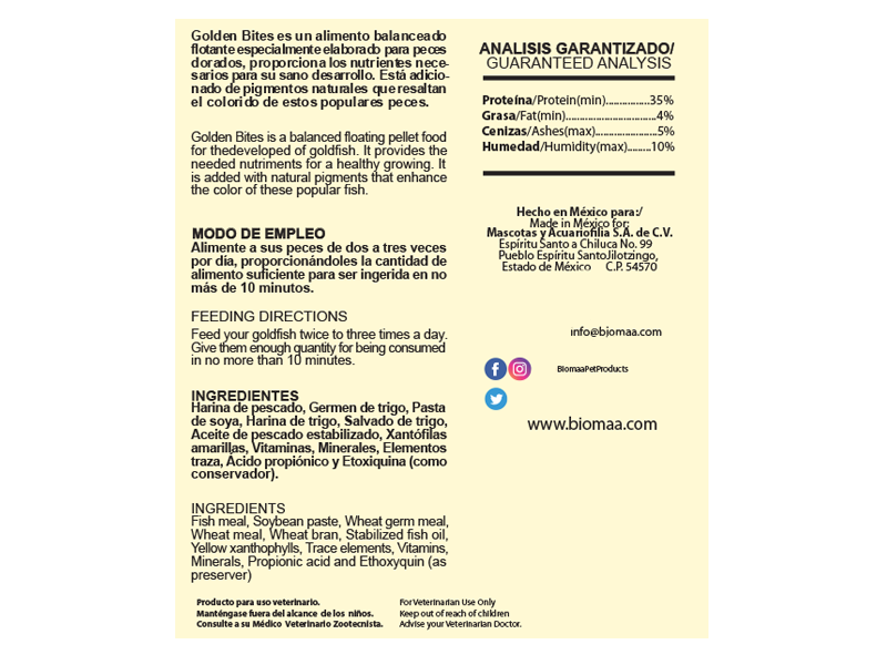 Golden Bites is a balanced food floating specially made for goldfish, provides the necessary nutrients for their healthy development. It is added with natural pigments that stand out the coloring of these popular fish.
