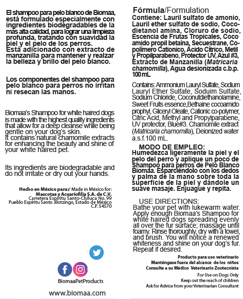 Biomaa’s shampoo for white hair, is specially formulated with Biodegradable ingredients of the highest quality, achieving a deep cleaning while gently treating dog’s skin and hair.